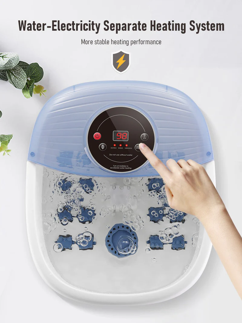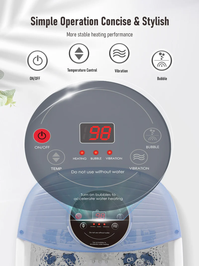 FULL-SOLE STIMULATION FOR TOTAL RELIEF Target every pressure point on your feet for maximum comfort and rejuvenation. Perfect for long days, athletes, or anyone on their feet. HEAT BUBBLES ROLL THERAPY 16 detachable rollers combined with soothing bubble jets provide a warm, spa-like massage that melts away fatigue, relieves sore feet, and boosts circulation. SOAK DEEP, RELAX FULLY Adjustable heating from 35°C to 48°C (95°F – 118°F) ensures the perfect warm soak, easing tension, reducing stress, and delivering professional-level foot care at home. AROMA-ENHANCED SPA EXPERIENCE Built-in aroma box elevates relaxation, combining calming scents with heat and massage for a true spa indulgence anytime. SMART & SAFE HOME USE LED control panel, 2 bubble outlets, and 60-minute auto-stop make operation effortless and safe, so you can enjoy daily foot therapy with zero hassle. Key Features Control Panel: LED Screen Material: Plastic Temperature Adjustment: 35 °C - 48 °C (95 °F - 118 °F) Detachable Rollers: 16 Build-in Aroma Box: Yes Bubble Cover: 2 Bubble Outlets Auto Stop (min): 60 Certification CE,FCC,ROHS