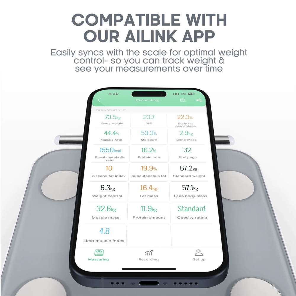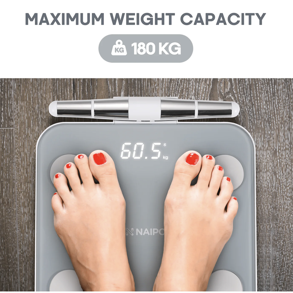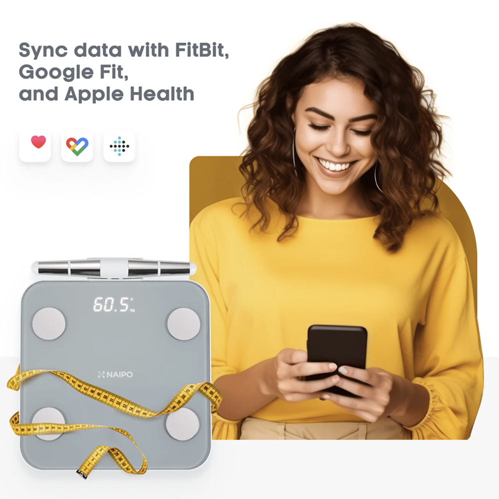 FULL BODY MEASUREMENT – The NAIPO Smart Scale uses 8 strategically placed electrodes to measure vital statistics across multiple body segments. More electrodes provide a greater degree of accuracy in measurements. BIOELECTRICAL IMPEDANCE ANALYSIS - BIA analysis produces 19 pieces of body data: Weight, BMI, Body Fat Percentage, Muscle Mass Percentage, Arms & Legs Muscle Mass Percentage, Bone Mass, Body Water Percentage, Basal Metabolic Rate (BMR), Protein Percentage, Body Age, Visceral Fat Level, Subcutaneous Fat Level, Ideal Weight, Weight Loss Recommendation, Fat Mass, Lean Mass, Muscle Mass, Obesity Level, and Protein Mass. COMPATIBLE WITH APP - Easily sync the scale with the AiLink app to customize your weight-control program and track your measurements over time. Download or share weight loss data, add friends to compete in weight loss journeys, set reminders, and compare your data before and after weight loss. Record and store data for up to 8 people in family management mode. Sync data with major health apps including FitBit, Google Fit, and Apple Health. HIGH PRECISION - The G-shaped sensor provides accuracy with 0.1kg. Customize measurements in kilograms (kg), pounds (lb), or stones (st) for use in different regions. The automatic power switch extends battery life.